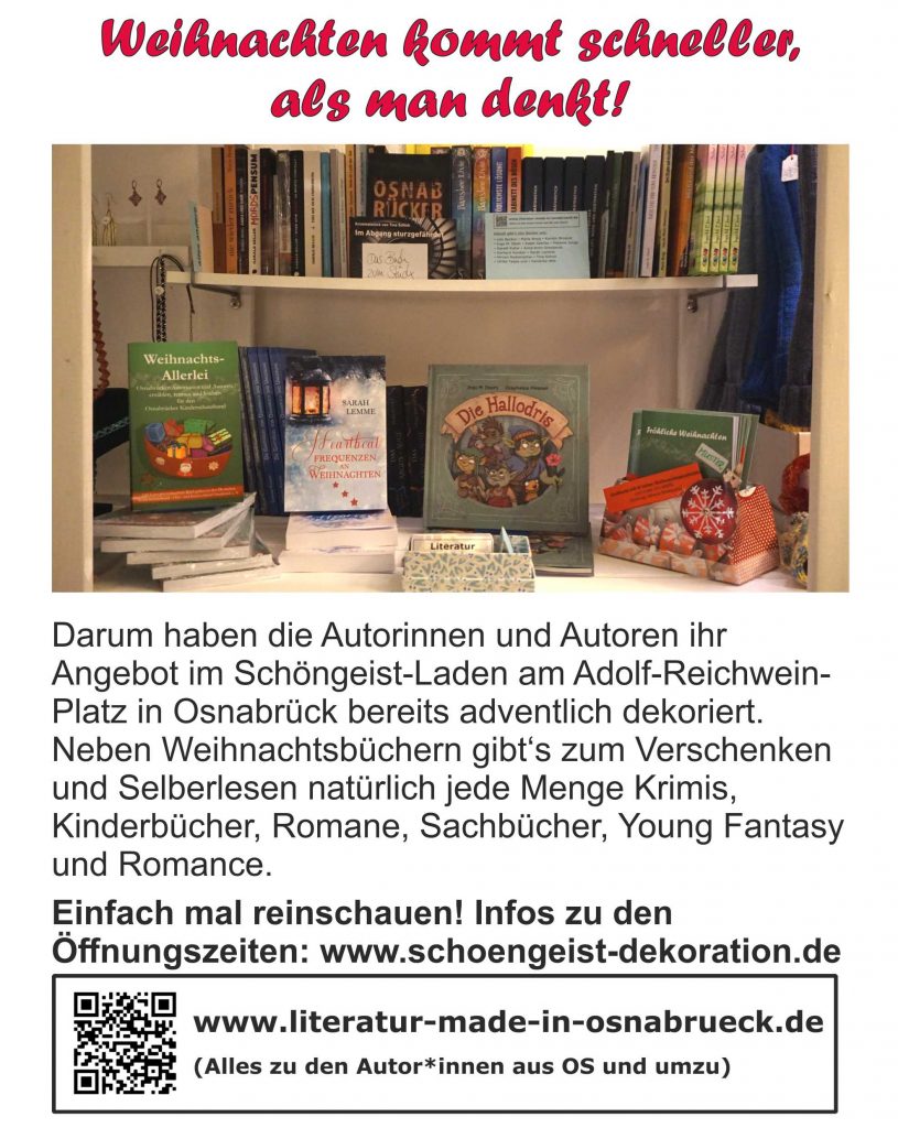 Ab 1. April 2025 gibt es hier in unserem neuen Buchshop im „Schöngeist“-Laden von Nadine Hartlage dauerhaft jede Menge Bücher von Udo Becker, Maria Braig, Anne Koch-Gosejacob, Kerstin Broszat, Ingo M. Ebert, Miriam Rademacher, Ralph Gehrke, Melanie Jungk, Harald Keller, Tina Schick, Sarah Lemme, Ulrike Teepe, Gerhard Kooiker, Olga Hopfauf, Stephan Baumgarten und Hendrike Witt.